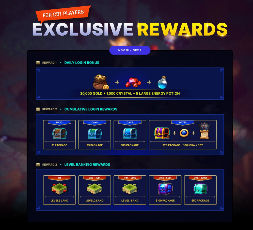 - Land NFTs will be distributed after the CBT and may take time. Package rewards arrive at official launch.